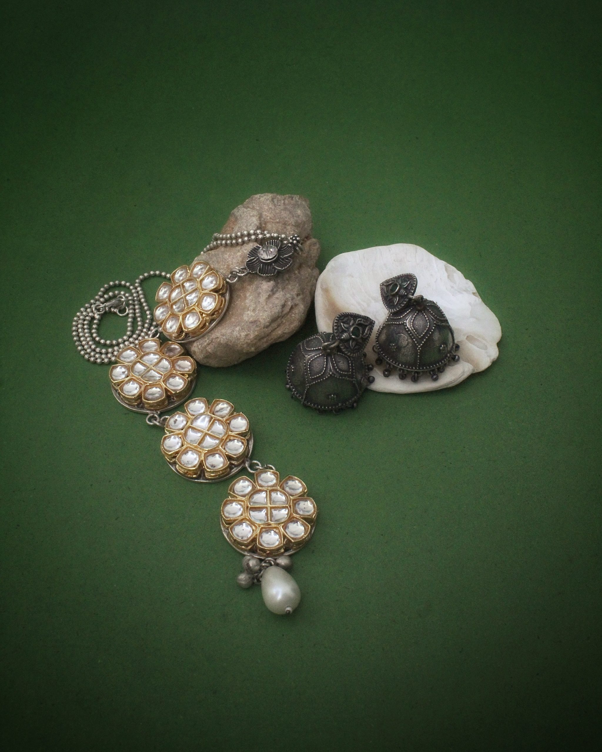 This is a high-quality product made of German silver including a premium Kundan Motif Necklace with vintage-style Jhumkies.