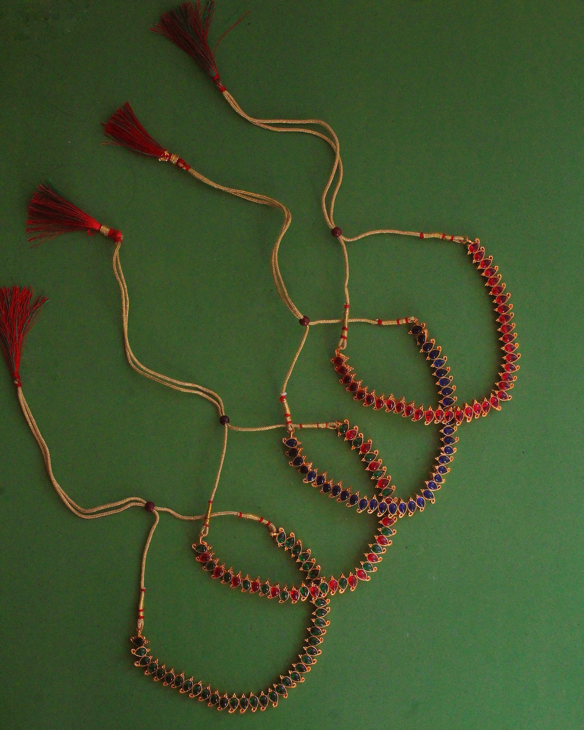 This is high-quality reversible mango-shaped necklace comes with a pair of two-color jhumkies.