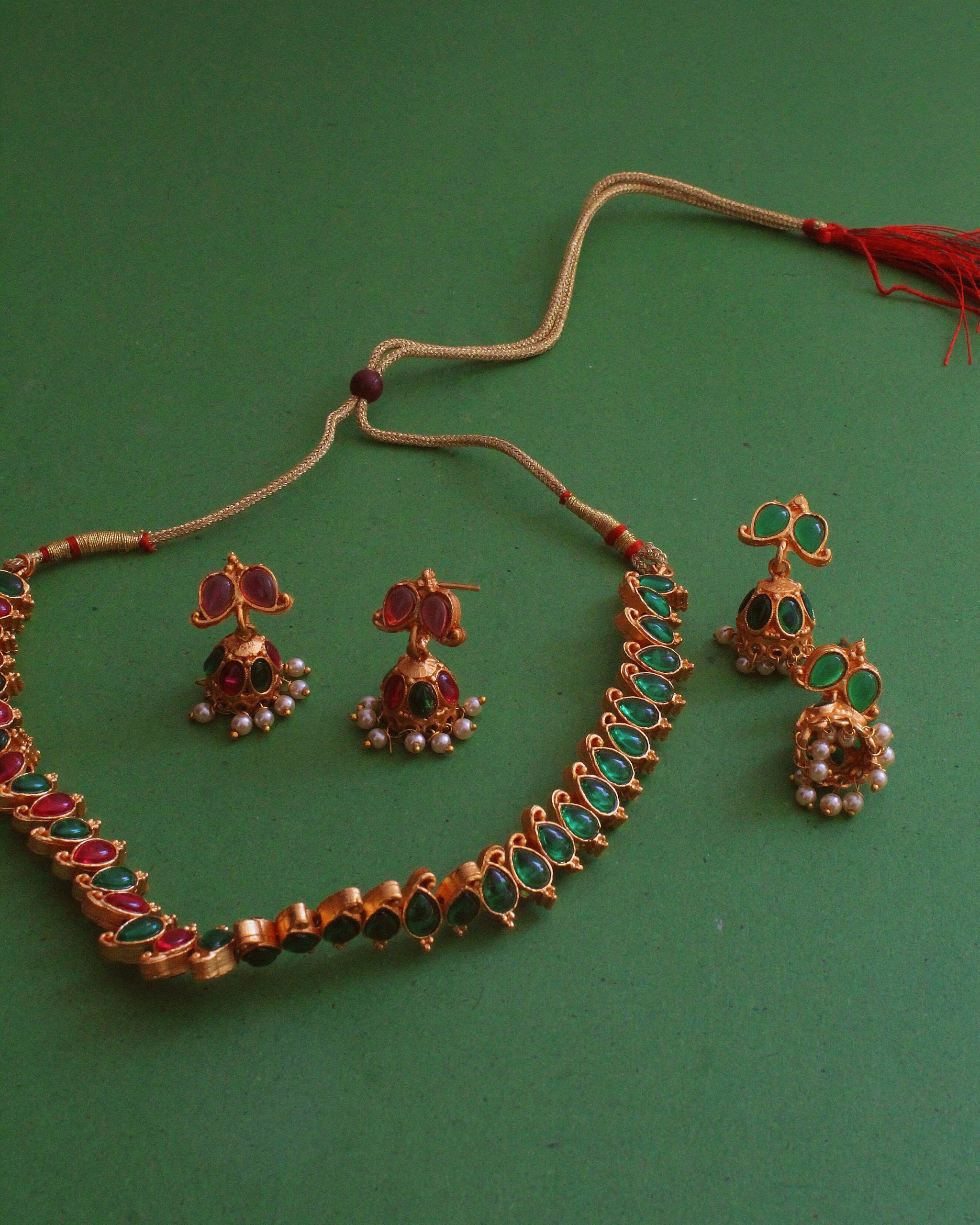 This is high-quality reversible mango-shaped necklace comes with a pair of two-color jhumkies.
