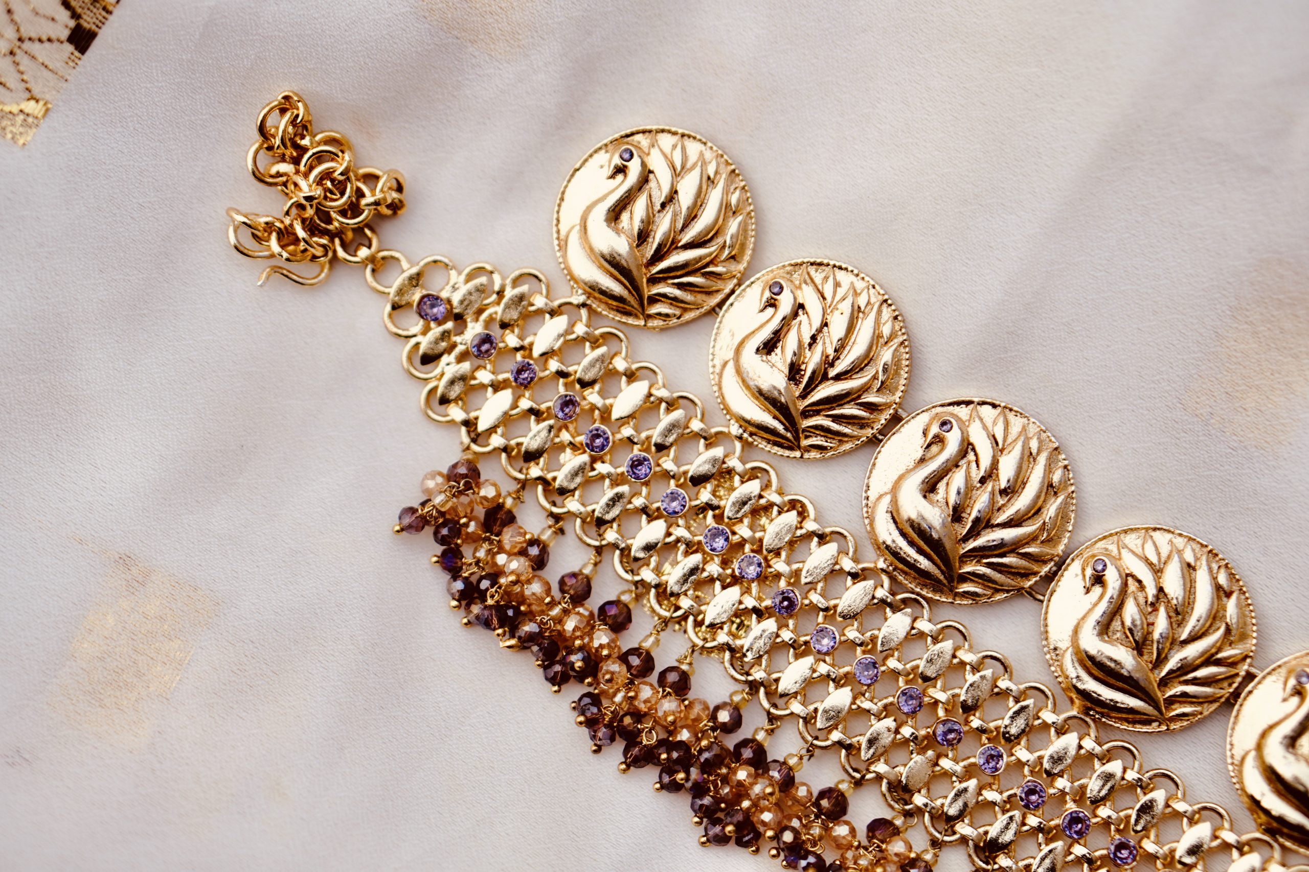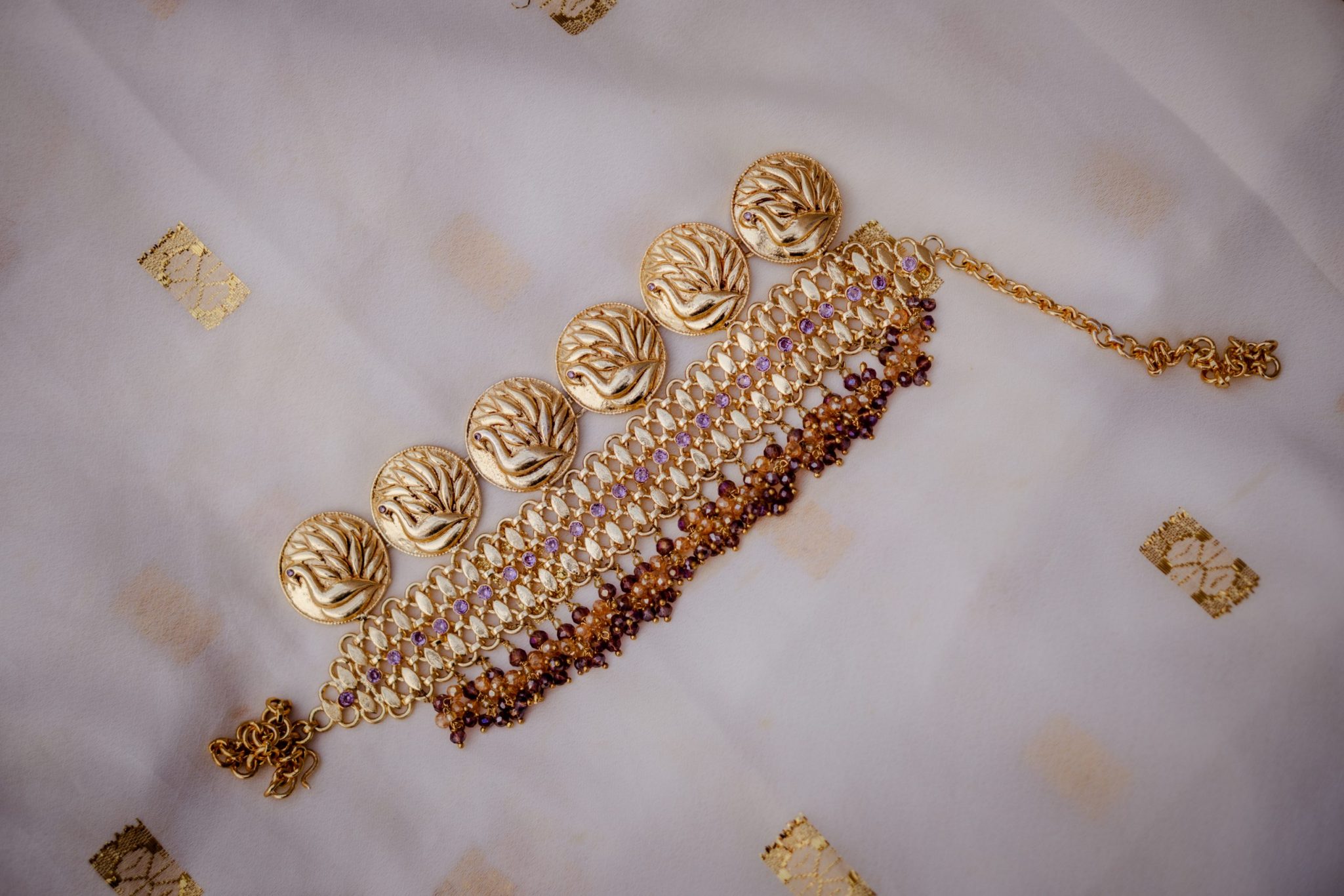 Introducing our Royal Houri Choker Set, featuring an exquisite antique peacock motif, and adorned with a high-quality gold polish that does not fade or tarnish. This set is crafted to resemble real gold, making it a timeless piece that you can pass on to generations.